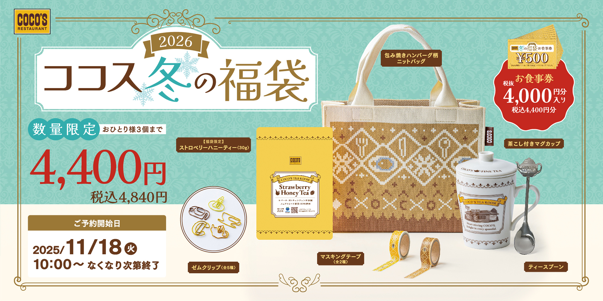 株式会社ファイブスタートップページ > 新着情報 > ココロはずむ!紅茶を楽しめるオリジナルグッズが登場!「ココス 冬の福袋2026」11月18日(火) 10:00より予約販売開始!