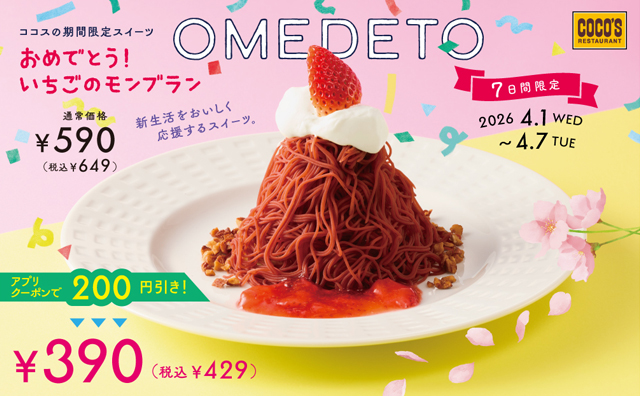 おめでとうの季節にぴったりな旬のいちごをトッピングした「おめでとう!いちごのモンブラン」が2026年4月1日(水)~4月7日(火)23:59の7日間限定でココスに登場♪