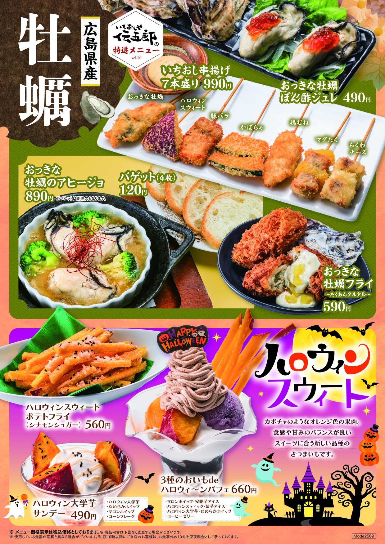株式会社ファイブスタートップページ > 新着情報 > 【10月2日(木) 販売開始!】伝五郎10月特選メニュー 季節を感じる!おっきな牡蠣とあま~いさつまいものメニューが登場します!