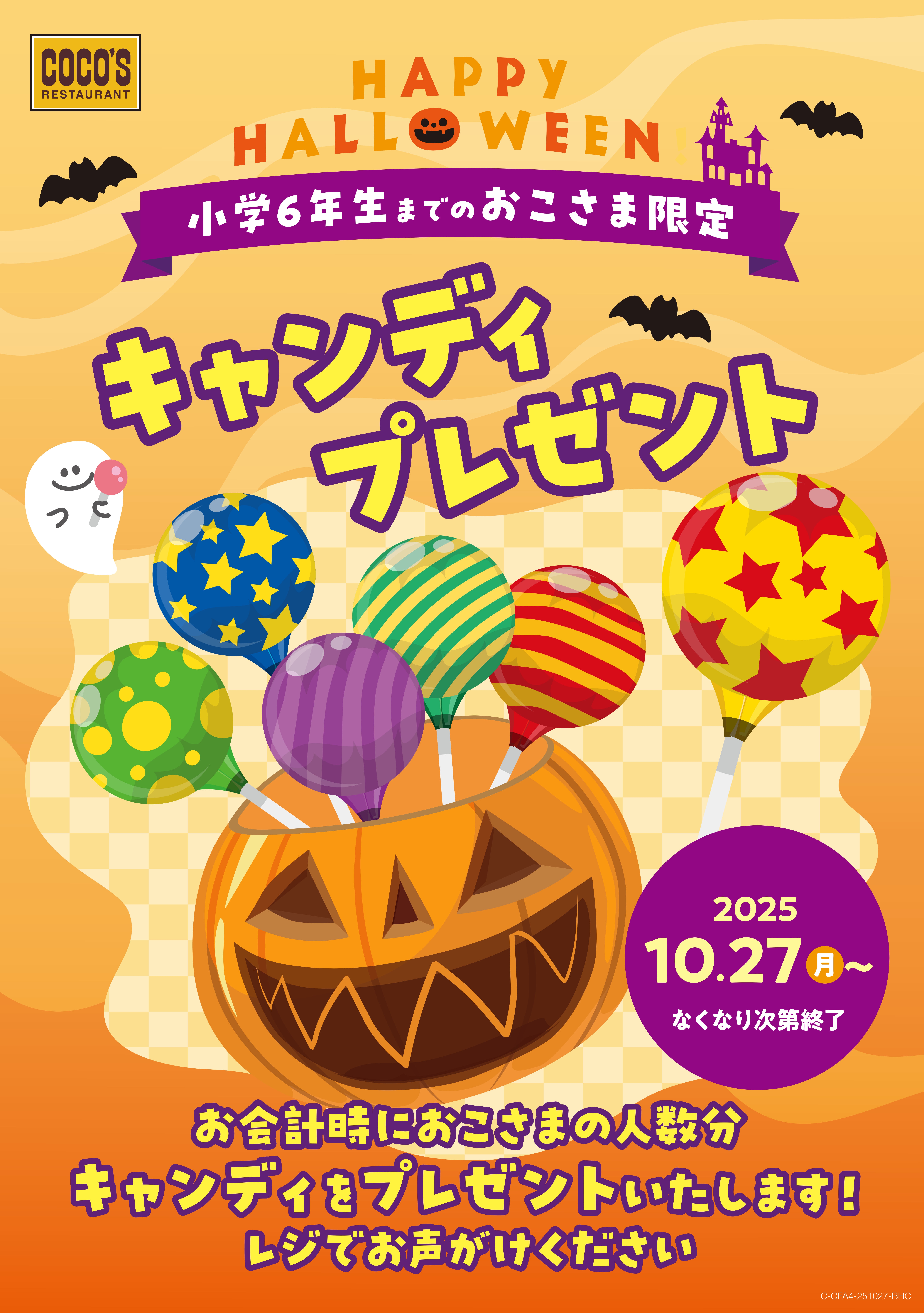 全国のココスで小学生までのおこさま限定で、お会計の際にレジにておこさまの人数分キャンディプレゼント♪キャンペーンを実施します。